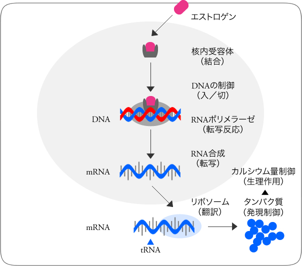 思春期から閉経期まで卵巣から分泌されたエストロゲンは遺伝子の発現量を制御することにより標的器官の生理機能を調節しています。エストロゲンは細胞の核内受容体と結合し、遺伝子の発現制御はmRNAを通じておこないます。遺伝子情報の元で転写されたmRNAは細胞質に核外輸送され、タンパク質の発現を制御します。エストロゲンはこのような遺伝子の制御機構を介して、月経や妊娠・出産だけでなく、脳、視床下部、免疫系、心臓、乳房、子宮、卵巣、肝臓、血管、皮膚など、全身の働きに大きな影響を与えます。エストロゲンの刺激による遺伝子発現レベルの変動は、エストロゲン応答遺伝子を搭載したDNAマイクロアレイで確認することが可能です。
